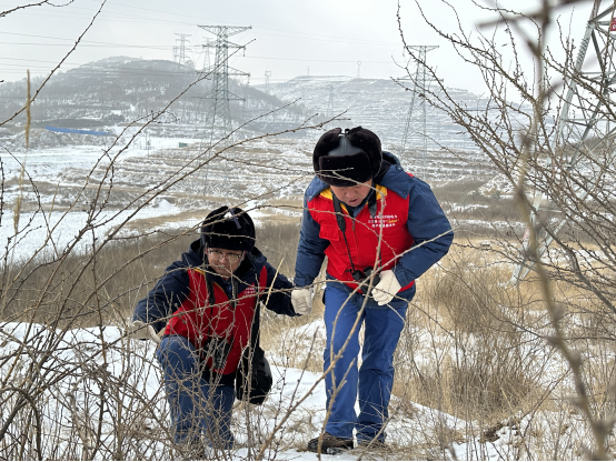 2月2日,国网西宁供电公司输电运检中心运维人员高伟和东主加雪后特巡110千伏景磊I回24号铁塔。(喇小青/摄)