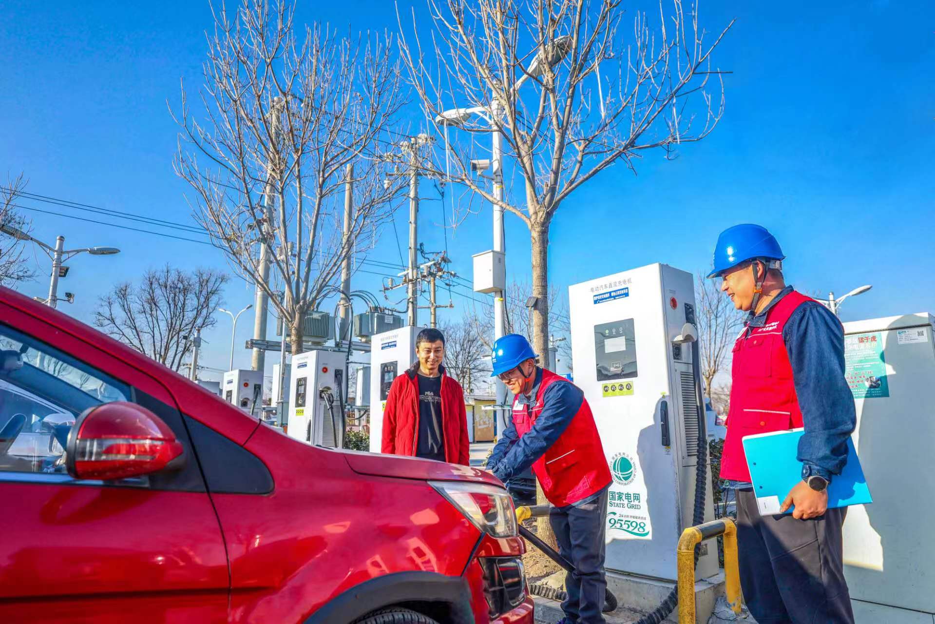 2月2日上午,在京哈高速公路田家府服务区电动汽车充电站,国网北京电力两名运维人员正在一边巡检充电设施,一边为需要帮助的车主提供充电服务。