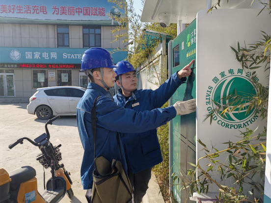 国网枣庄供电公司永安供电所员工查看“大象换电”换电柜蓄电池充电情况。(娄倩 摄)