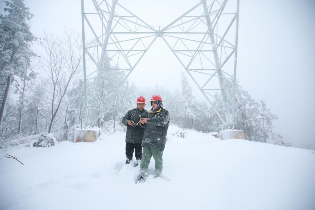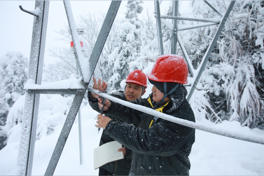 湖南浏阳市蕉溪镇蕉溪岭,国网长沙供电公司输电检修人员张丰和盛定龙在海拔400米的冰情监视哨附近,对220千伏浏集Ⅰ线034号杆塔开展覆冰情况监测。 邓梁/摄