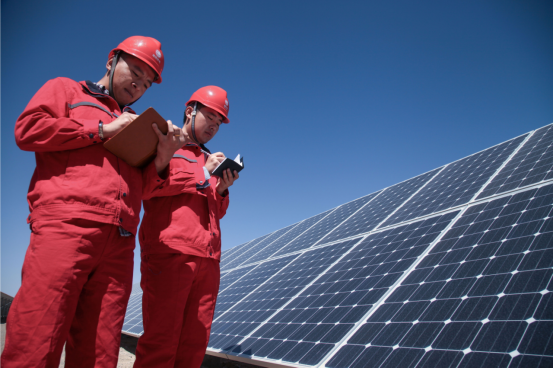 图为国网青海电力三江源(海西调控)共产党员服务队在格尔木市光伏园区10兆瓦玛多光伏扶贫电站检查设备 何启金/摄