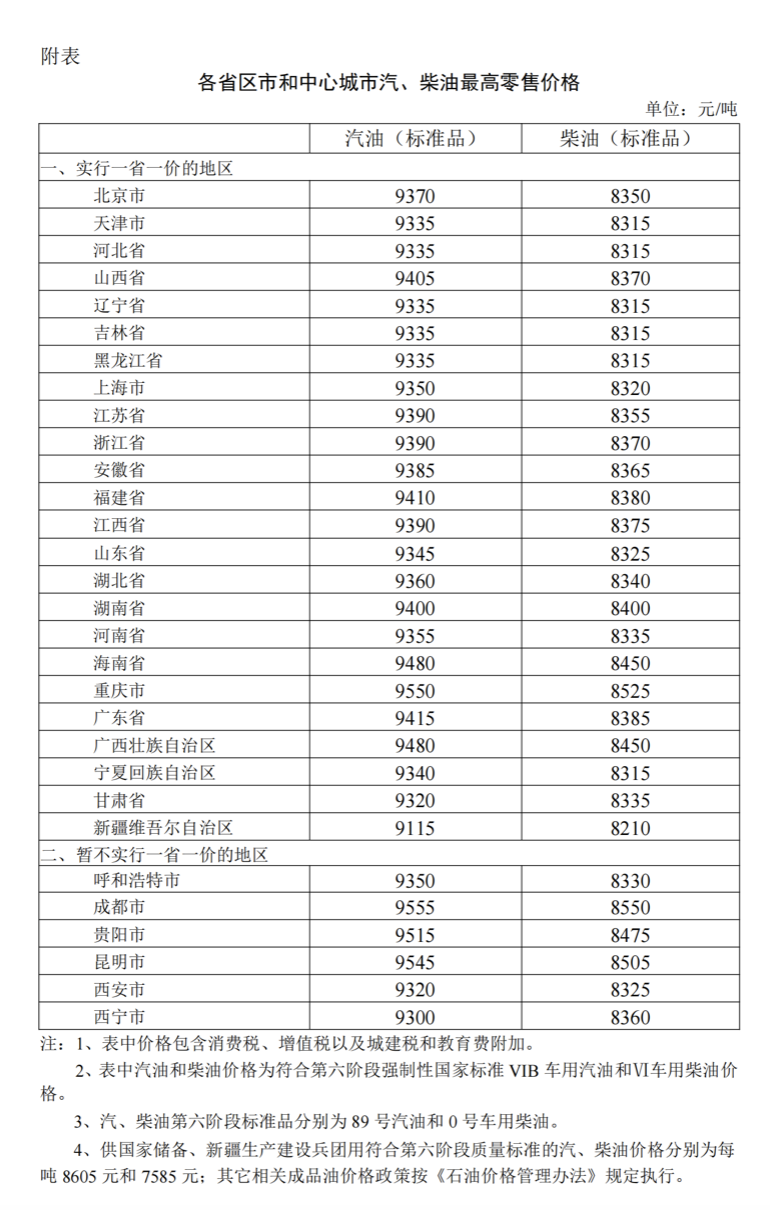 附:各省区市和中心城市汽、柴油最高零售价格