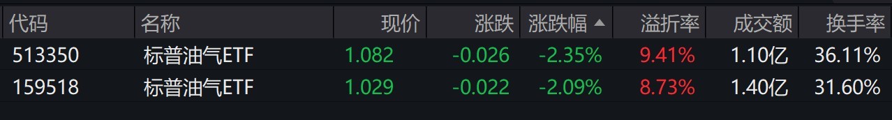 今日场内标普油气ETF跌逾2%,但溢价率仍在9%左右,开盘一刻钟两只ETF换手率均超30%。