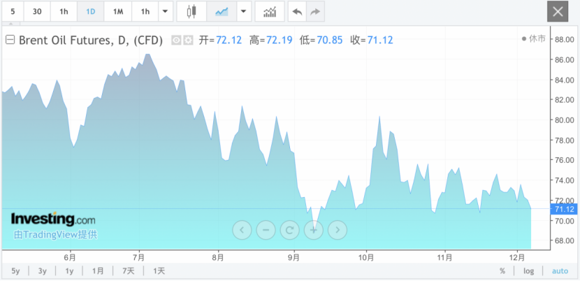 随着市场继续消化“欧佩克+”延迟退出自愿减产的最新决定,国际原油价格继续下跌,周五尾盘跌幅扩大,截至当天收盘,WTI 1月原油期货收跌1.10美元,报67.20美元/桶,跌幅1.61%;布伦特2月原油期货收跌0.97美元,报71.12美元/桶,跌幅1.34%。