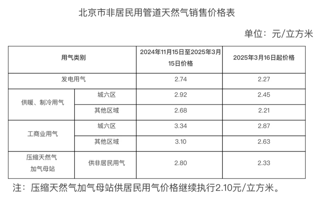 今年11月15日至明年3月15日,发电用气价格是2.74元/立方米,城六区和其他区域的供暖制冷用气价格分别为2.92元/立方米、2.68元/立方米,城六区和其他区域的工商业用气价格分别为3.34元/立方米、3.1元/立方米,压缩天然气加气母站供非居民用气价格为2.8元/立方米。