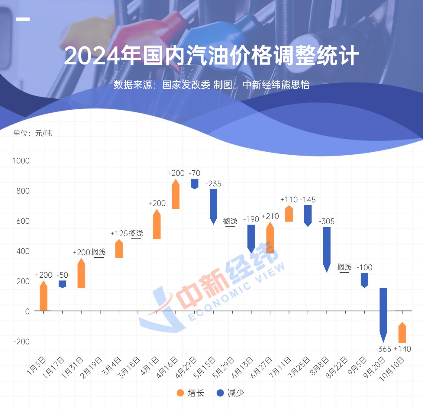 今年以来,国内油价已经历二十轮调整,分别为“八涨八跌四搁浅”。涨跌互抵后,国内汽、柴油价格每吨较去年底分别下跌75元、70元。若本次价格上涨,2024年成品油调价将呈现“九涨八跌四搁浅”格局。