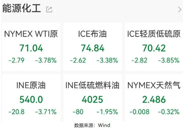 受此影响,NYMEX WTI原油下跌2.79美元,跌幅3.78%,收报71.04美元/桶;ICE布油下跌3.38%,报74.84美元/桶;INE原油也下跌3.71%,收于540元/桶。