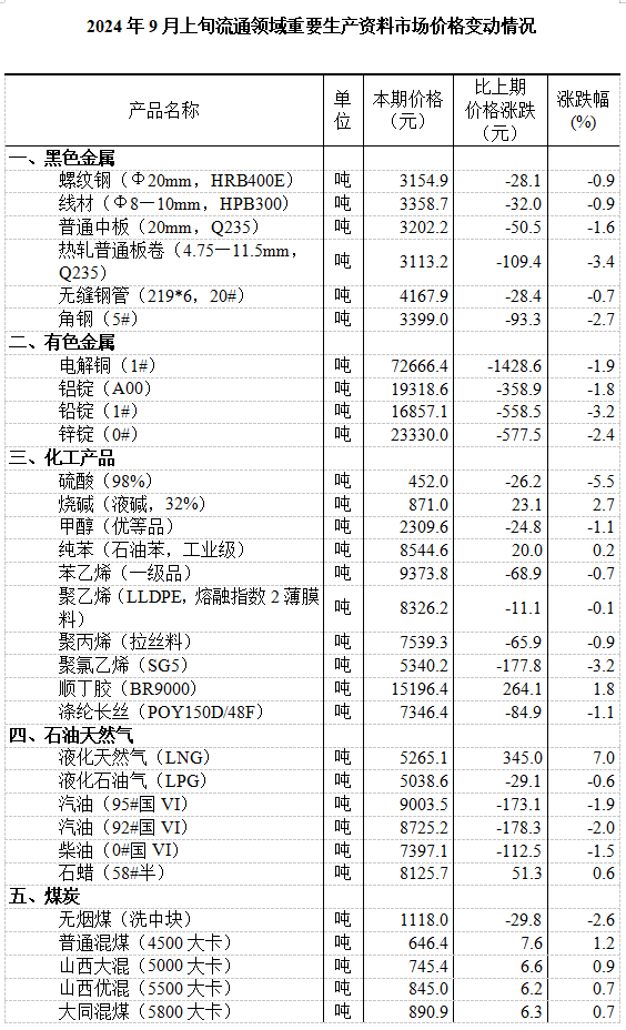 财联社9月14日电,国家统计局发布2024年9月上旬流通领域重要生产资料市场价格变动情况,2024年9月上旬,全国流通领域的重要生产资料市场价格监测显示,50种产品中,18种价格上涨,30种下降,2种持平。其中,液化天然气价格涨幅最高,达7%。