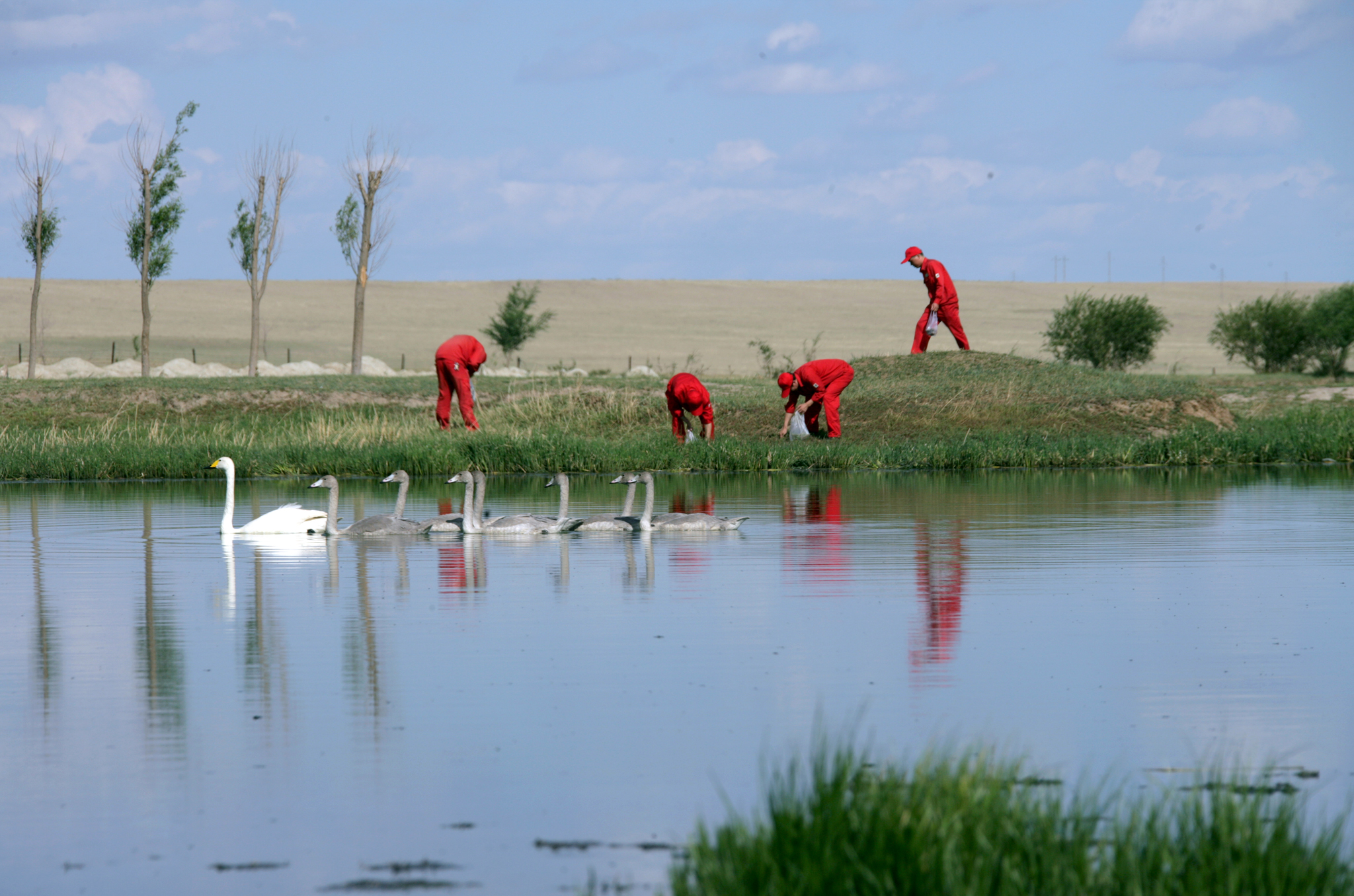 中国石油华北油田志愿队在东湖湖畔维护湿地环境。杨伟奉 摄