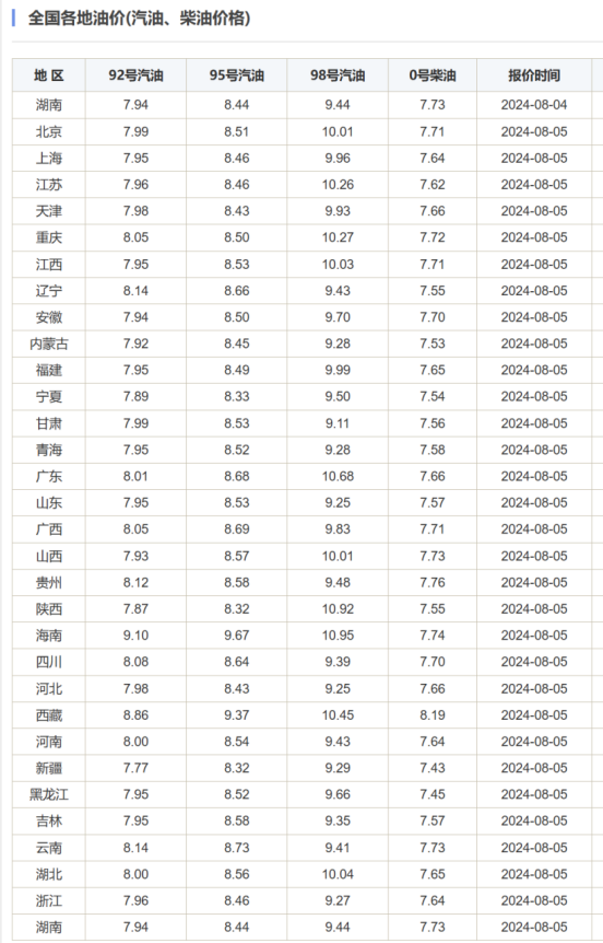 近期国际油价下行,国内成品油价格也随之回落。在上一轮油价调整中(7月25日),国内汽、柴油价格每吨分别降低145元、140元,折算后92#汽油、95#汽油、0#柴油每升将分别下调0.11元、0.12元、0.12元。调整过后,国内大部分地区92#汽油价格均回到8元/升以内。