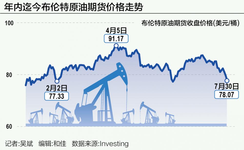 在多重利空拖累下,国际油价一度跌至近两个月低点。7月30日,布伦特原油期货下跌1.4%至78.63美元/桶,美国原油期货下跌1.4%至74.73美元/桶。