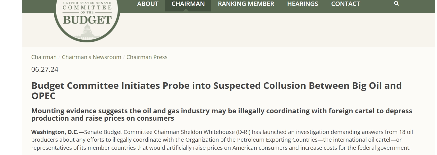 民主党参议员、预算委员会主席谢尔登·怀特豪斯周四发布声明称:“鉴于针对谢菲尔德的调查结果,我试图了解在美国运营的其他石油生产商,是否也一直在与欧佩克就石油的生产与定价进行(非法)串通。”