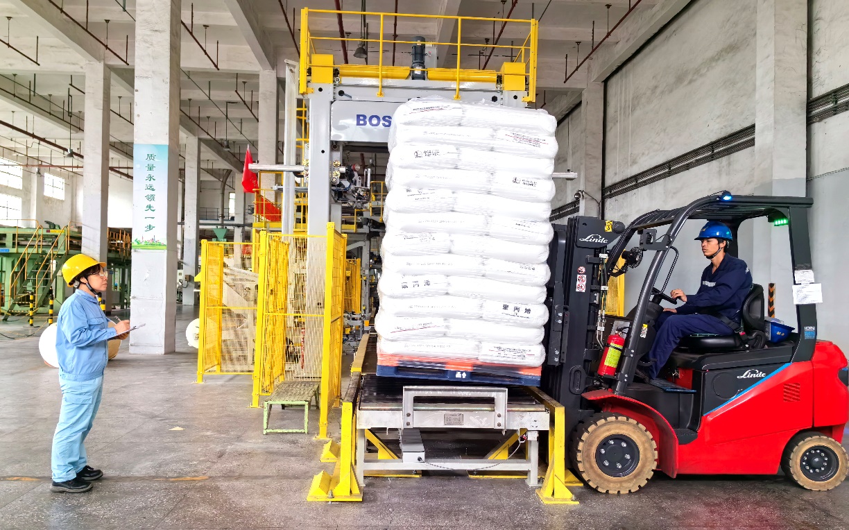 近日,广州石化1号聚丙烯装置包装套膜机项目建成投用,包装线上,产品有序套膜包装后送至指定货位,待发货出厂。