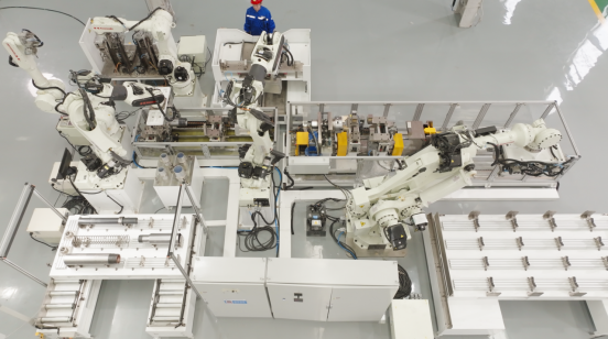 四台6轴机器人正在协助作业进行“海弘”产品的智能装配作业。