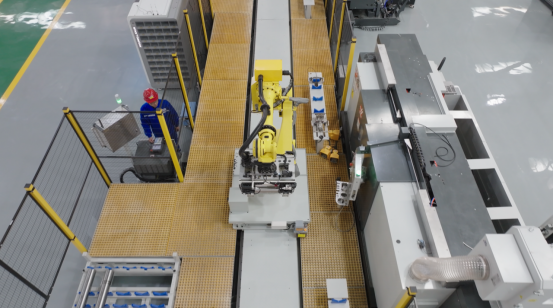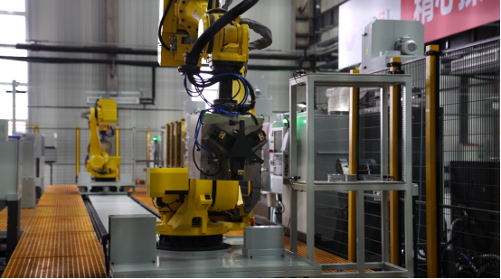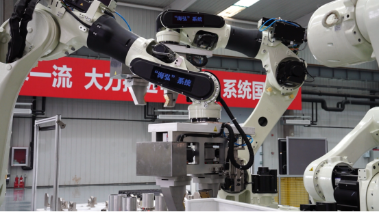 “海弘”系统智能化生产线上,机器人正在进行加工单元内部工序流转作业。
