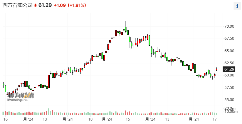 周二盘中,西方石油股价涨近1.8%,现报每股61.29美元。