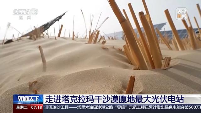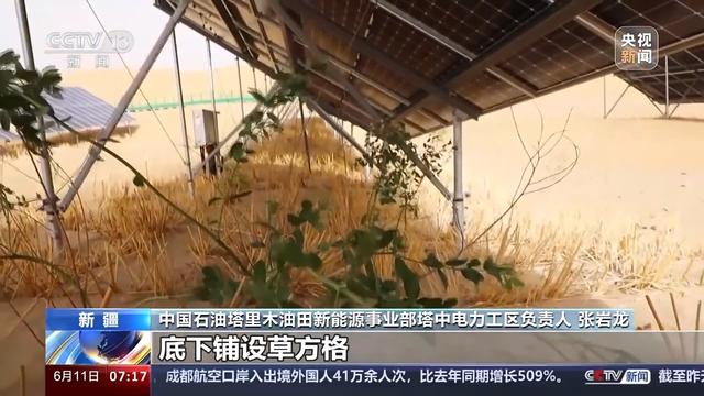 中国石油塔里木油田新能源事业部塔中电力工区负责人 张岩龙:在设计之初,我们就考虑到固沙的效果。我们在建设光伏板的同时,底下铺设草方格,而且在咱们整个场站周边,50米宽的范围内,全部铺设了几百万平方米的草方格,可以看到起到非常好的效果。