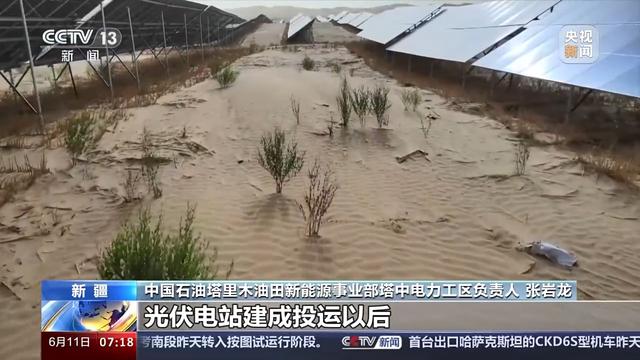 中国石油塔里木油田新能源事业部塔中电力工区负责人 张岩龙:减弱了风的侵袭速度,同时对地表沙的流速,也起到一定减缓的作用,尤其光伏板下面形成的阴凉,对于植被的生长,也起到了非常好的促进作用。光伏电站建成投运以后,原本不毛之地,现在也长出了大约1500株的绿色植被。在原有基础上,我们再人工种植一些植被,希望这一片绿色不断地发扬壮大,希望明年这里长出更多绿色。
