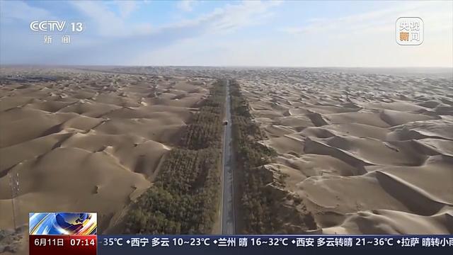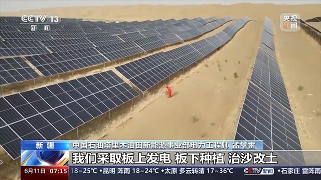中国石油塔里木油田新能源事业部电力工程师 孟攀雷:沙漠公路光伏发电,开启了“阳光养绿”新模式,我们采取板上发电、板下种植、治沙改土、水资源综合利用为一体的循环发展模式,来改造沙漠腹地生态环境。