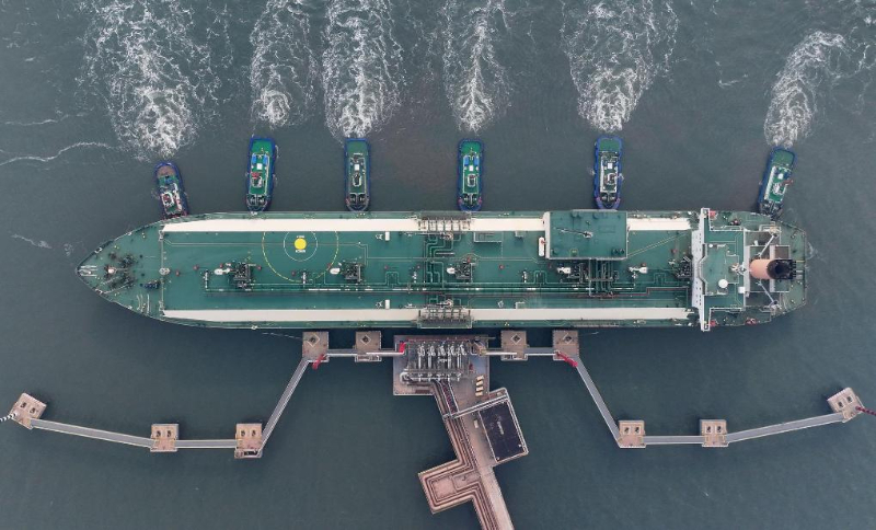 2023年11月15日,来自卡塔尔的“阿尔达夫那”号LNG轮在拖轮的协助下向唐山港曹妃甸港区中国石油唐山LNG接收站码头靠泊(无人机照片)。新华社记者杨世尧摄