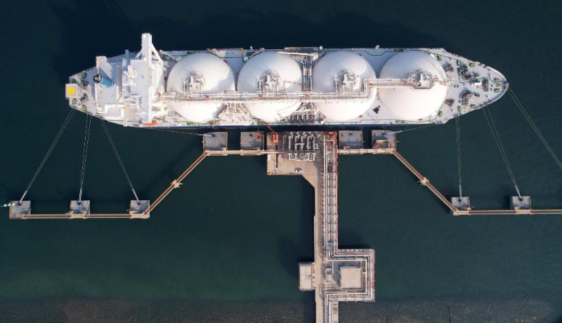 2022年10月21日,一艘液化天然气运输船靠泊在中国石化天津LNG接收站“1号泊位”进行卸船作业(无人机照片)。新华社记者赵子硕摄