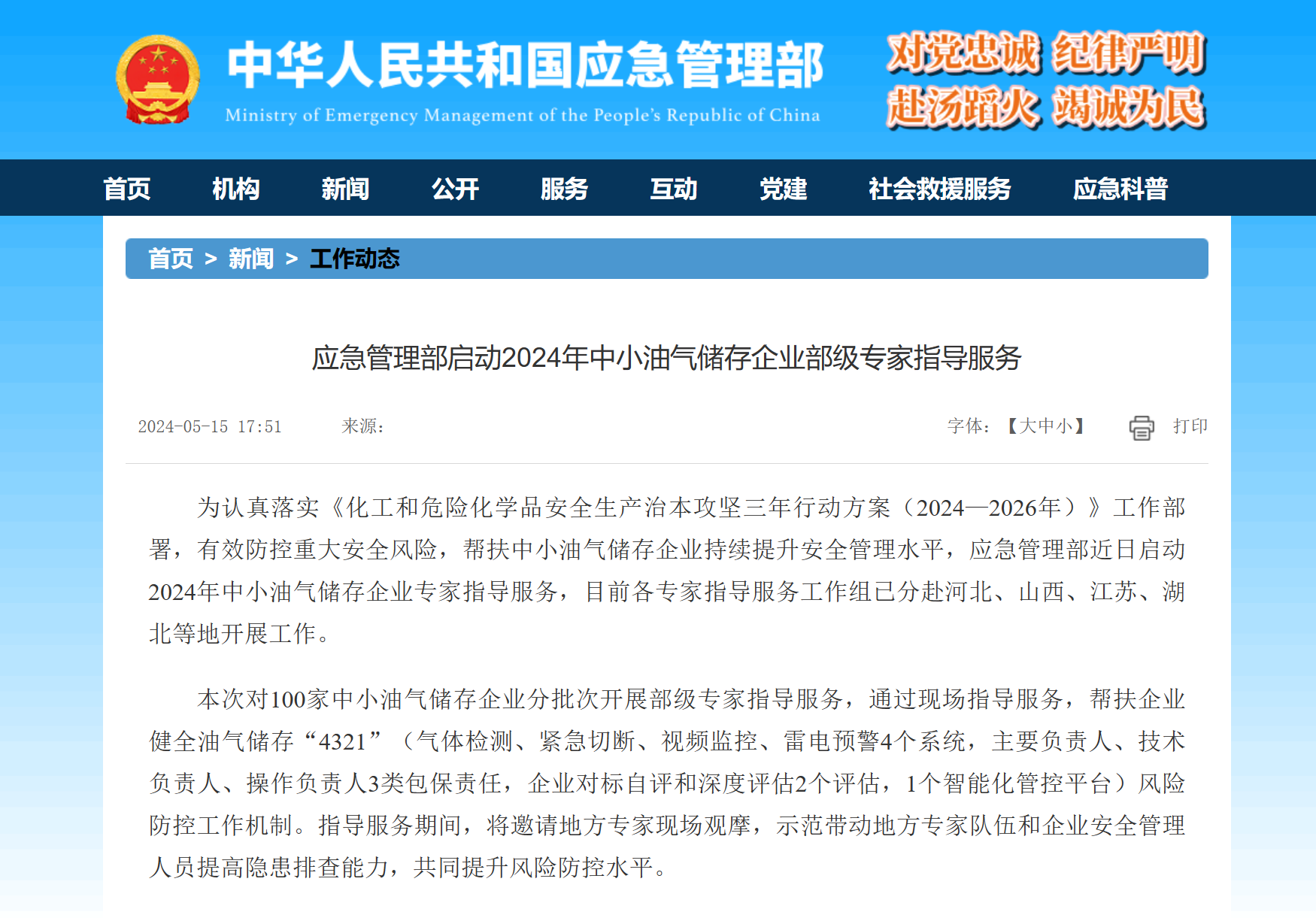 据应急管理部网站消息,为认真落实《化工和危险化学品安全生产治本攻坚三年行动方案(2024—2026年)》工作部署,有效防控重大安全风险,帮扶中小油气储存企业持续提升安全管理水平,应急管理部近日启动2024年中小油气储存企业专家指导服务,目前各专家指导服务工作组已分赴河北、山西、江苏、湖北等地开展工作。