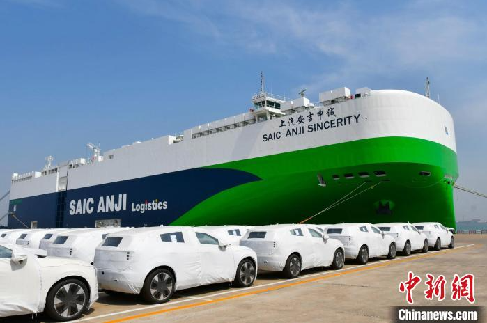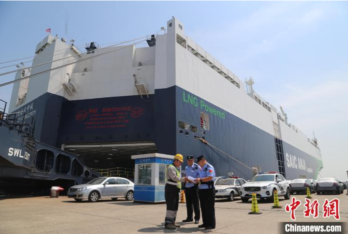 ▲东港边检站开通“绿色通道”保障“上汽安吉申诚”号远洋滚装船顺利通关。天津东港边检站/供图