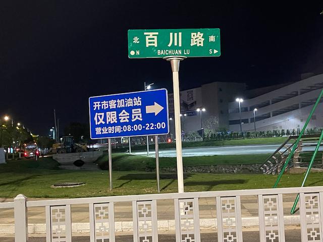 第一财经记者在Costco南京加油站入口处看到“自助加油”和“会员制加油”的字样,营业时间为早上8点到晚上10点。在入口的立牌上,用中文和英文标示了Costco加油站。