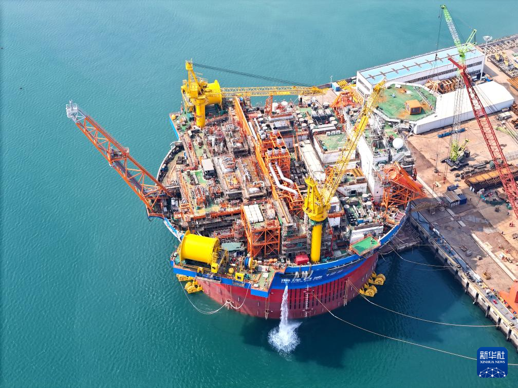 4月7日,“海洋石油122”浮式生产储卸油装置(FPSO)在海油工程青岛场地进行海上倾斜试验及调试(无人机照片)。 当日,由我国自主设计建造的亚洲首艘圆筒型“海上油气加工厂”——“海洋石油122”浮式生产储卸油装置(FPSO),在海油工程青岛场地进行海上倾斜试验及调试,为项目年内投产奠定基础。 “海洋石油122”被称为“超级能源碗”,最大排水量10万吨,最大储油量6万吨,可连续在海上运行15年不回坞。 新华社发(张进刚 摄)