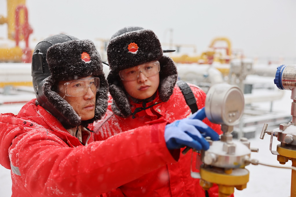 大港油田驴驹河储气库岗位员工查看压力表参数(2023年12月20日摄)。新华社发(大港油田供图)