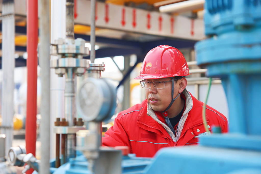 大港油田板南储气库运维工程师在生产装置区查看设备设施运行状态(2024年3月10日摄)。新华社发(大港油田供图)