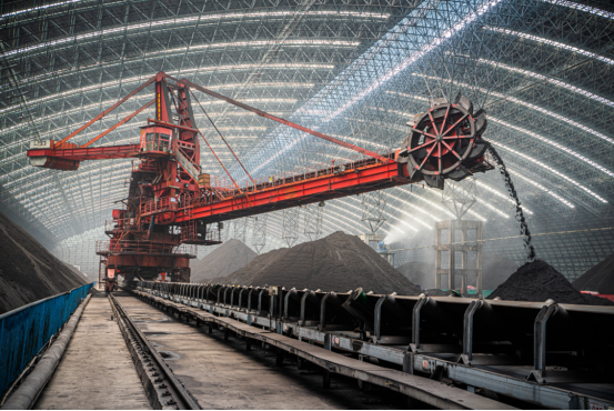 ▲在梁山港储煤棚内,自动化悬臂式斗轮堆取料机每台每小时可堆取煤炭2500吨-3000吨,为煤炭转运提供有力保障,确保迎峰度夏。(图片来源:济宁能源发展集团)