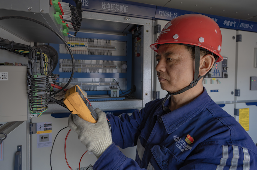 图为禹长征正在检查胶带机配电柜电气线路 付泽/摄