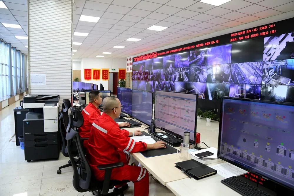 在选煤厂调度指挥中心,调度员们一边紧盯监控屏幕,随时观察生产情况,一边接打电话,通过智能一体化管控平台实时监控全厂设备的运行状态,操作着设备的进度启停和停送电作业,并记录装车外运的煤种、车型和节数等数据。