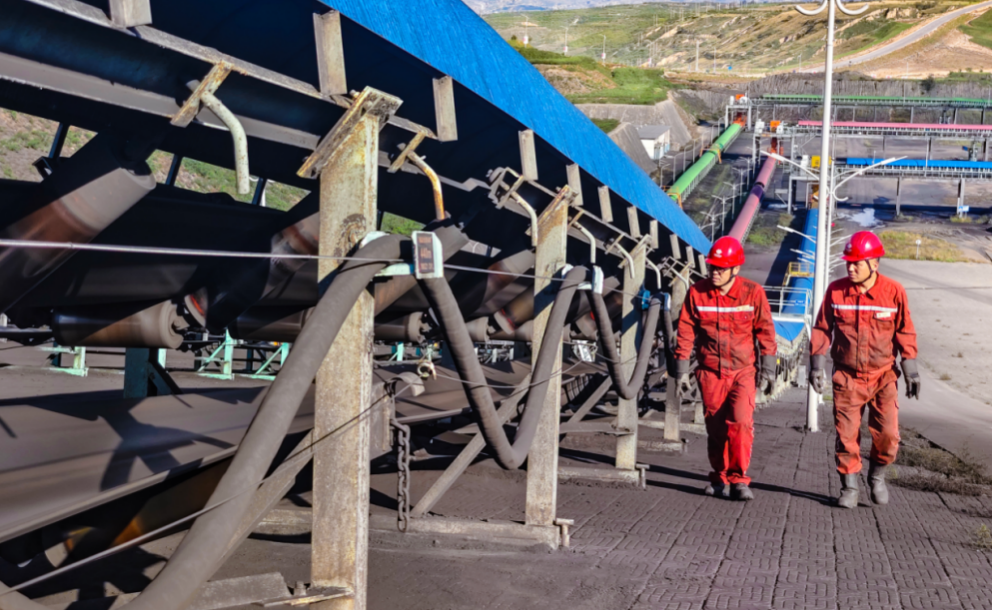 准能选煤厂原煤车间职工郭蕴文与同事正在巡查输煤皮带运行状态。