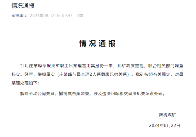 据此前网络反映,河南永城庄某峰称,去年自己在办理退役军人优待证时,发现身份被表弟吕某某冒用,后者以他的名字在河南永煤新桥煤矿工作。