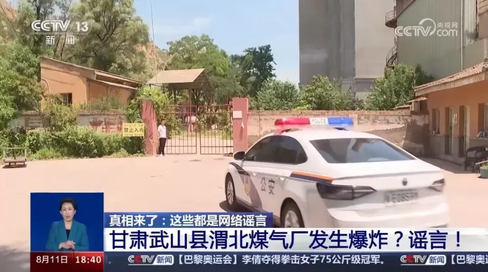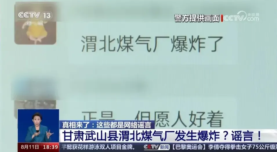 8月11月,中央电视台新闻频道《共同关注》栏目以《真相来了:网传“甘肃武山县渭北煤气厂发生爆炸武山县”系谣言》为题,报道了甘肃省武山县公安机关打击处理的1起网络谣言案件,警示广大网民自觉遵守法律法规,理性上网,共同维护健康清朗的网络环境和社会秩序。
