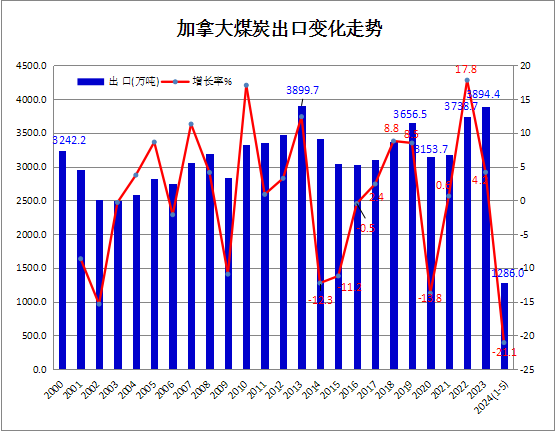 据加拿大统计局(Statistics Canada)发布的商品进出口统计数据,2024年1-5月份,加拿大煤炭出口量累计为1285.97万吨,比上年同期下降21.1%。