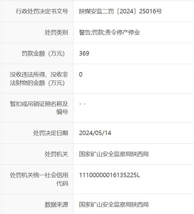 据信用陕西官网信息显示,5月14日,榆林市横山县恒硕矿业有限公司被国家矿山安全监察局陕西局警告并开出369万元的罚单,同时责令停产停业。