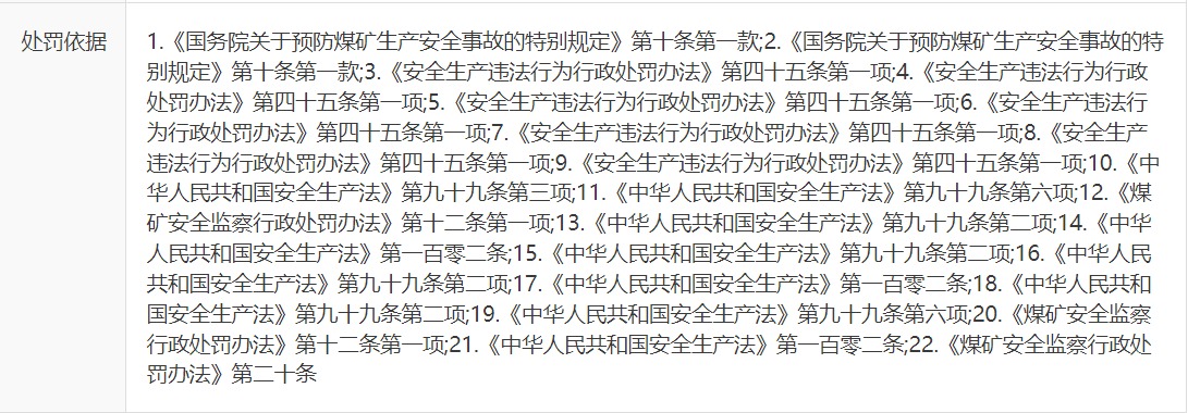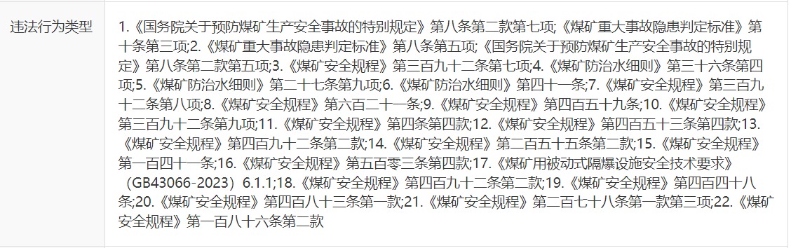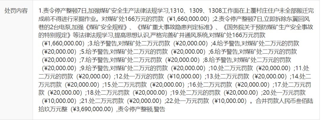 公开的处罚决定书中违法事实一列显示,该公司最大的两笔罚款来自“擅自开采(破坏)安全煤柱,存在工作面未经正规设计、安全论证和审批直接进入上覆村庄安全煤柱”和“通风系统不完善、不可靠”,单项均被处以166万元罚款。