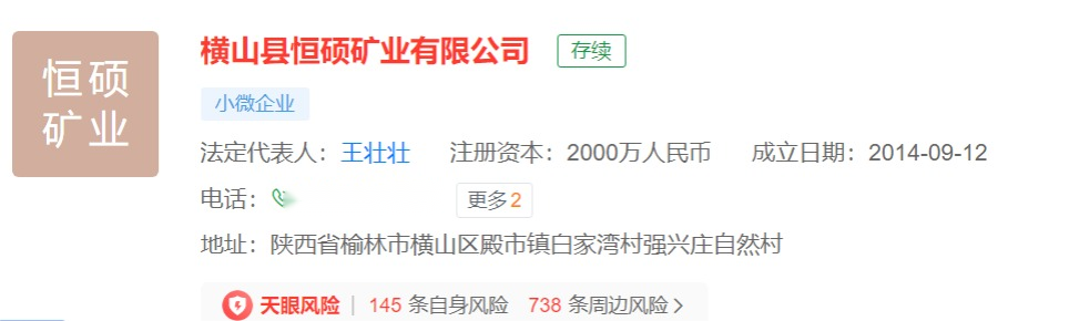 天眼查APP数据显示,横山县恒硕矿业有限公司成立于2014年,注册资本2000万,法定代表人王壮壮。