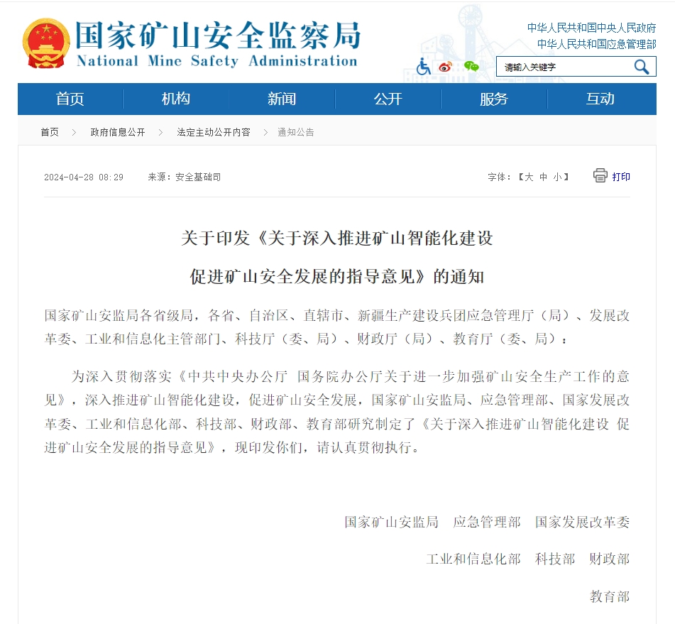 矿业是国民经济发展的重要支柱性产业,智能化建设是推动矿山安全发展、保障国家能源资源安全的重要举措。近年来,我国矿山智能化建设蓬勃发展,取得积极成效,但还存在发展不平衡、不充分、不协调等问题。为深入贯彻落实《中共中央办公厅 国务院办公厅关于进一步加强矿山安全生产工作的意见》,深入推进矿山智能化建设,促进矿山安全发展,现提出如下意见。