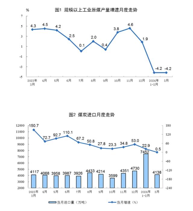 原煤生产基本稳定,进口同比增长。3月份,规上工业原煤产量4.0亿吨,同比下降4.2%,增速与1—2月份持平;日均产量1288万吨,仍处较高水平。进口煤炭4138万吨,同比增长0.5%。