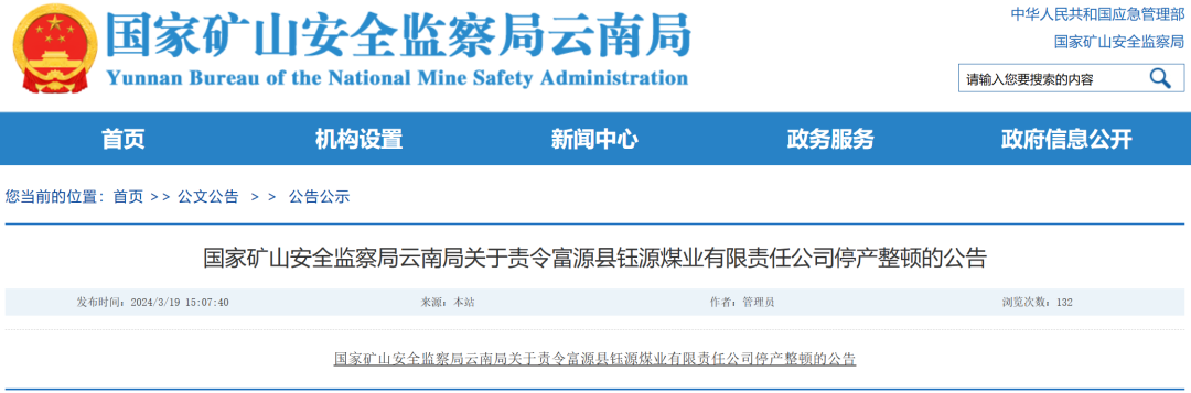 3月19日,国家矿山安全监察局云南局发布《关于责令富源县钰源煤业有限责任公司停产整顿的公告》。