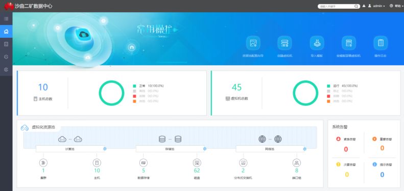 “一朵云”——云数据中心。该矿于2021年建设了基于虚拟化的数据中心,对已建的主要信息化系统进行了虚拟化迁移,为待建的信息化系统提供足够的计算和存储空间,实现了对接入系统和数据的统一管理和统一运营。同时,该平台也为矿井未来更多信息化系统建设提供了充足的基础资源。