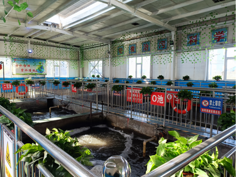 为了打赢“碧水”保卫战,沙曲选煤厂以水污染根源治理为目标导向,科学优化污水处理工艺,强化现场污水处理设备管理,在生活污水处理站同步安装处理水在线监测系统,对COD(化学需氧量)、氨氮、总磷等指标进行实时精准监测,双系统处理能力为1000m³/日,36万m³/年,全部用于生产系统复用,生产水实现洗水闭路循环。同时,以施行《黄河保护法》为契机,先后实施雨污分离、厂区入河口治理等环保工程,初期雨水收集池与7000m³的浓缩池贯通,前20分钟收集的厂区雨水全部用于生产系统复用,坚决杜绝污水外流。