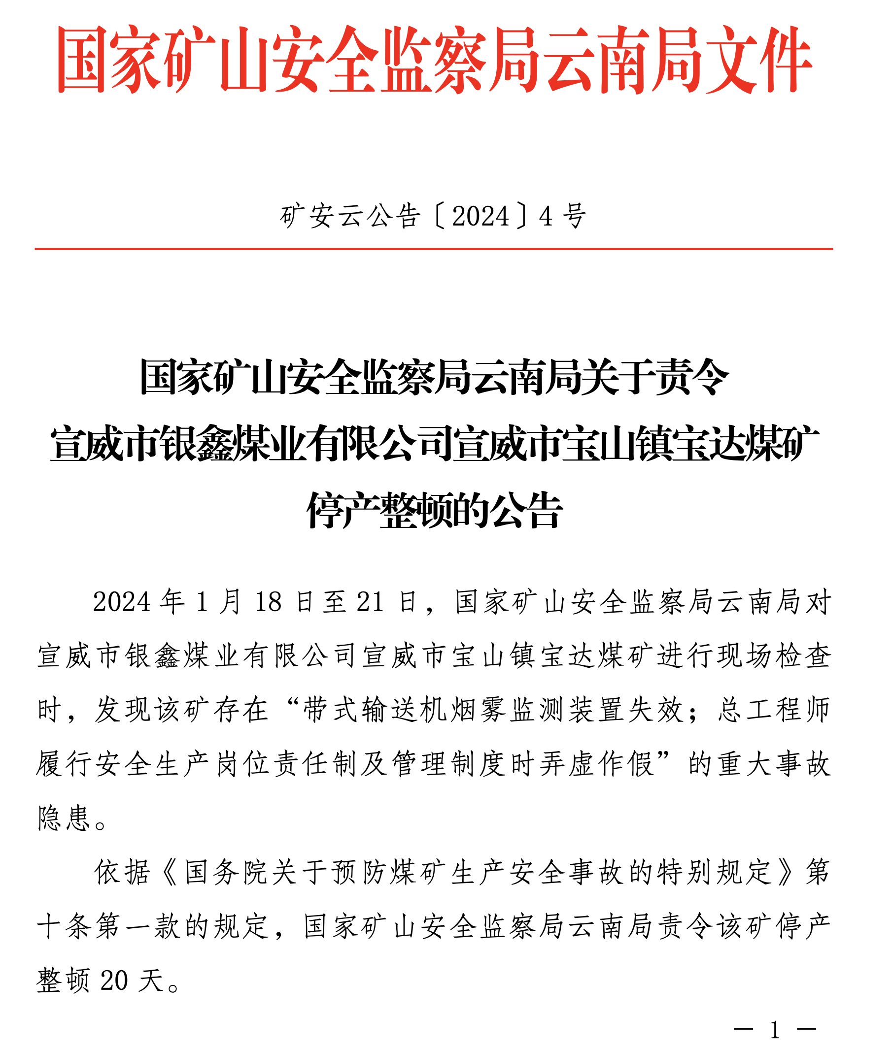 公告显示,2024年1月18日至21日,国家矿山安全监察局云南局对宣威市银鑫煤业有限公司宣威市宝山镇宝达煤矿进行现场检查时,发现该矿存在“带式输送机烟雾监测装置失效;总工程师履行安全生产岗位责任制及管理制度时弄虚作假”的重大事故隐患。