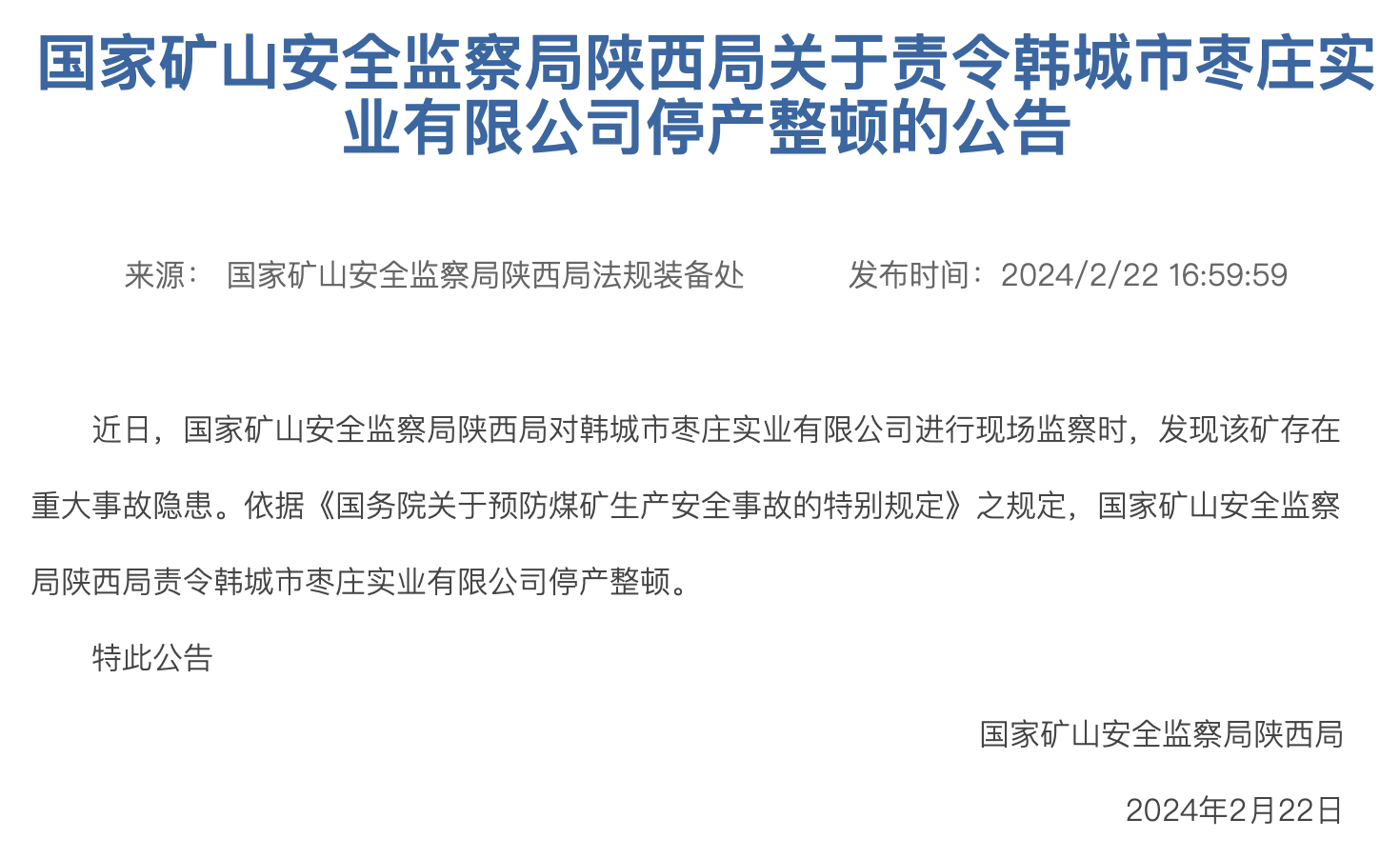 2月22日,国家矿山安全监察局陕西局发布关于责令韩城市枣庄实业有限公司停产整顿的公告。