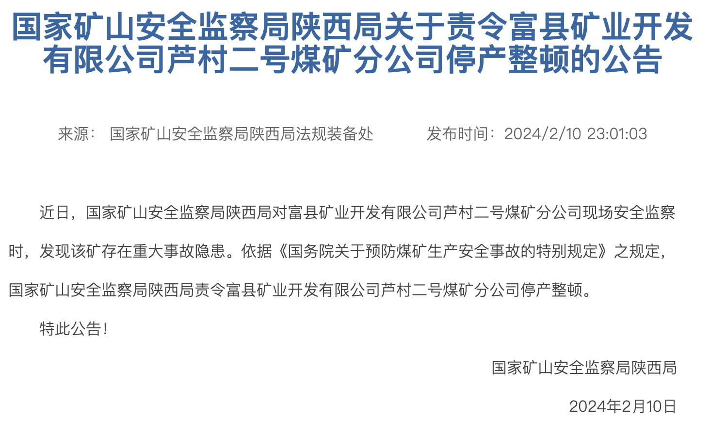 2月10日,国家矿山安全监察局陕西局发布责令富县矿业开发有限公司芦村二号煤矿分公司停产整顿的公告。