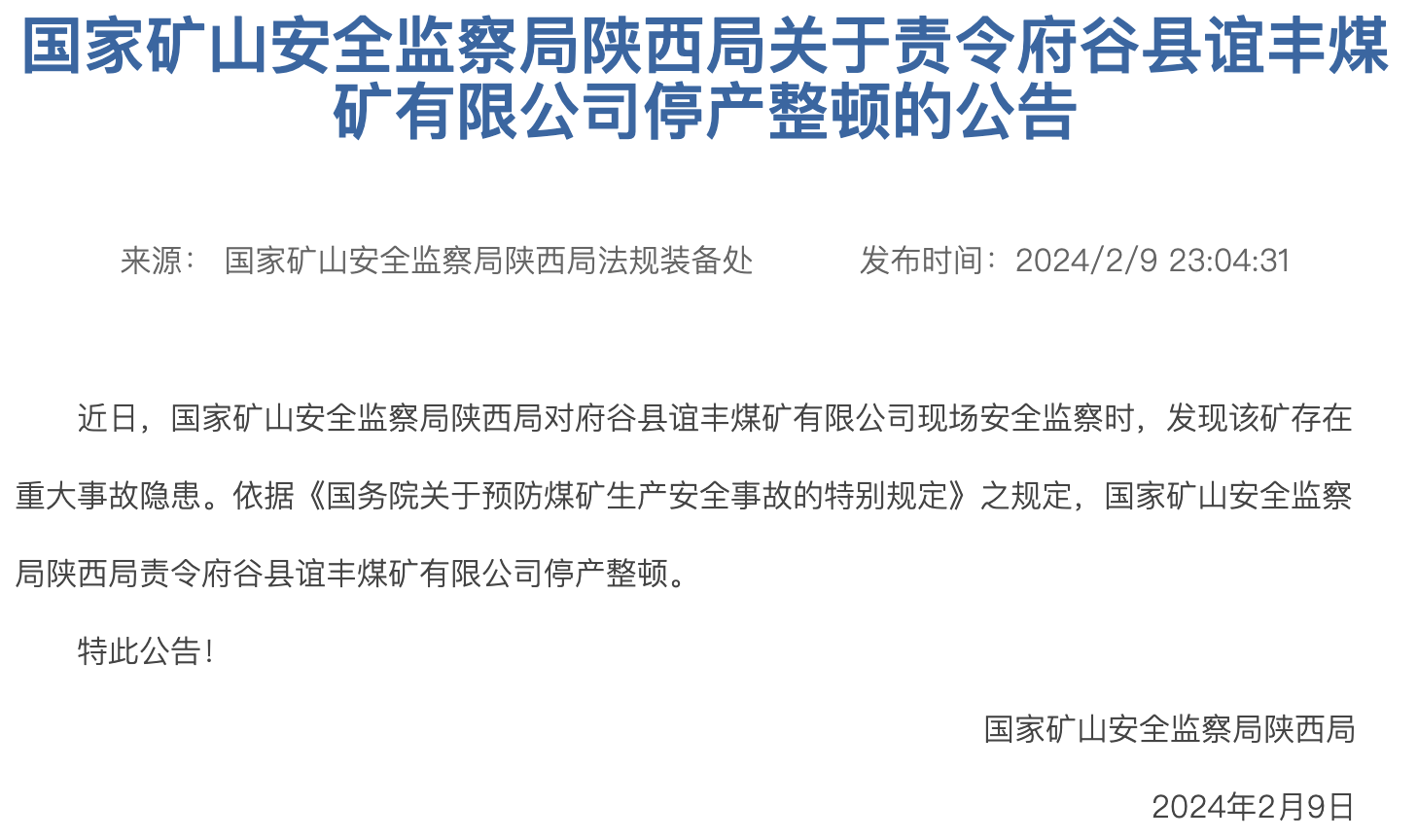 2月9日,国家矿山安全监察局陕西局发布责令府谷县谊丰煤矿有限公司停产整顿的公告。
